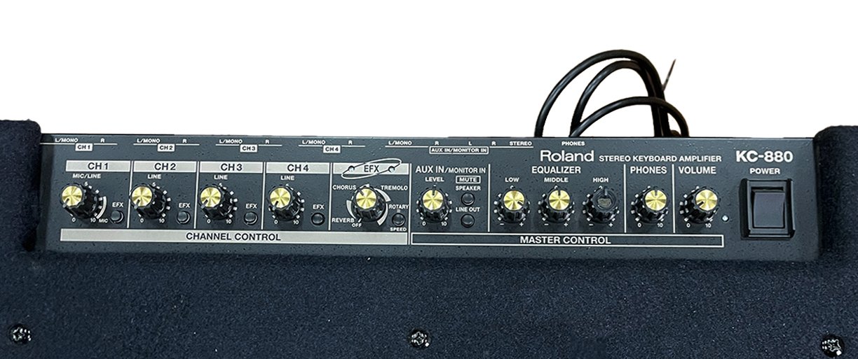 The new top of the line KC amp series features high-performance features. With 5 stereo input channels, 320 watts of power and Roland's renowned DSP effects, the KC-880 is portable and powerful for keyboards, vocals and more. Give your keyboards the massive power boost they deserve with the Roland KC-880 stereo mixing keyboard amplifier. Packing 320 Watts of stereo power through dual 12-inch woofers and two horn tweeters, the KC-880 has what it takes to get your sound to the back of the room. And if you need even more oomph than that, you can link two KC-880 amps together in stereo. Built-in DSP effects -- including reverb, chorus, tremolo, and rotary -- allow you to refine your tone throughout your performance, while 5 channels of stereo input and a balanced XLR input make it a piece of cake to integrate Roland's KC-880 keyboard amplifier into any setup.