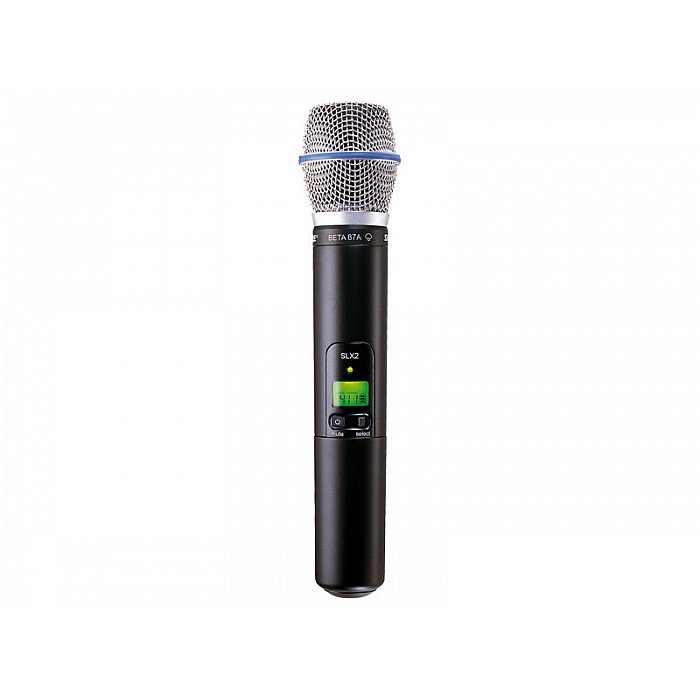 The Shure Wireless Microphone consists of the SLX2 Transmitter with Beta 87A Supercardioid Microphone. The Shure SLX2 includes timed backlit LCD display, frequency and power lockout, and "Mute" functionality. Its design allows for interchangeable microphone cartridges. With a smooth, tailored response for warm, accurate sound, the Beta 87A vocal microphone leads the field for studio-quality sound in live performance.
