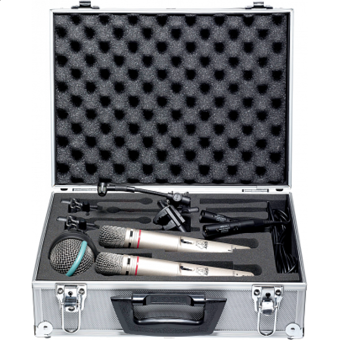 The AKG Drum Set II Big is a complete microphone package for drum and percussion capturing. The package includes four AKG MicroMics with gooseneck mounts, D112 large diaphragm dynamic microphone with SA60 mount, two C1000 condenser microphones and metal case for storage and travel. The package is an ideal solution for capturing drums and percussion in live sound reinforcement or recording applications.