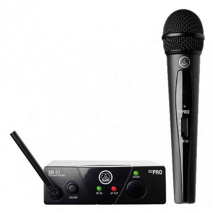 The WMS 40 Mini Vocal Wireless System features AKG's unique HDAP (High Definition Audio Performance) technology ensures the best possible, most realistic sound at any time. The system includes an SR 40 MINI receiver, a HT 40 MINI handheld transmitter, a universal power supply with US/UK/EU adapter, and one AA size dry battery.