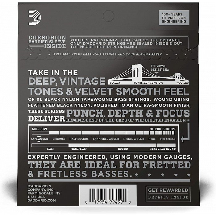 D'Addario's XL Nickel Electric Bass Strings offer a distinct, bright tone, with excellent intonation and a "fret-friendly" nickel round wound feel that make them the top choice of bass players of all genres around the world. The nickel-plated wrap wire is ideal for magnetic pickups, relaying the highest sound quality. All D'Addario strings are precisely wound around a hexagonally shaped high-carbon-steel core wire by computer-controlled machines guaranteeing clear intonation, rock-solid fundamentals, and incomparable consistency in every string. The tight core tension produced through this rigorous quality-controlled process results in a harmonically rich, longer-lasting string. XL Nickel are the industry standard in electric bass strings. With their clear fundamentals, booming tight lows, and reliable D’Addario construction, they’re trusted by players everywhere to handle any performance.