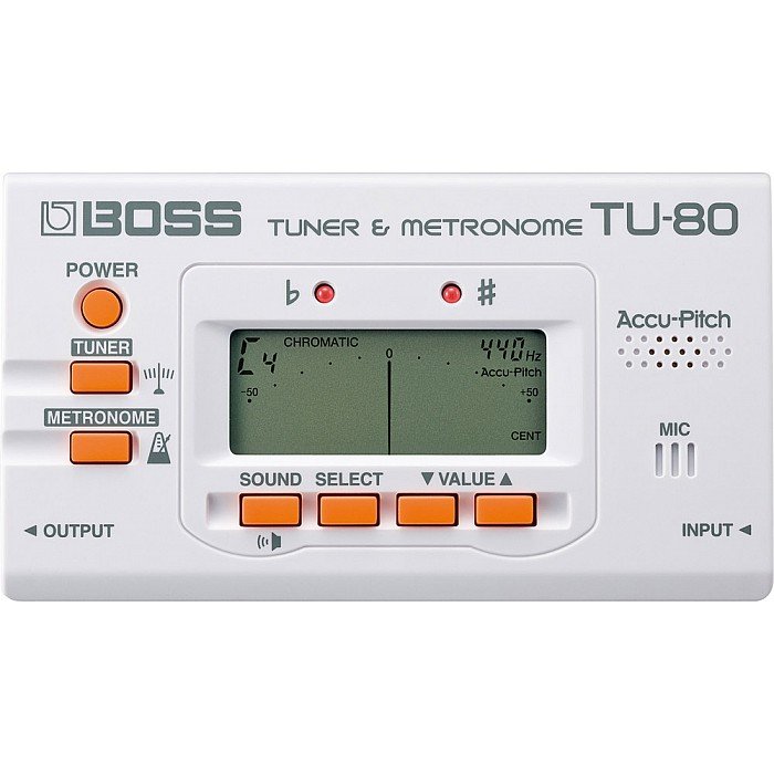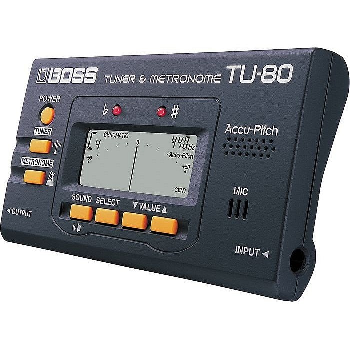 The reliable Boss TU-80 Tuner & Metronome includes a handy, built-in metronome with 7 rhythms and 10 beats, plus a cool animated LCD display. Multiple features and an ultrawide tuning range of almost 8 octaves make it easy to get the precise tuning you need.
