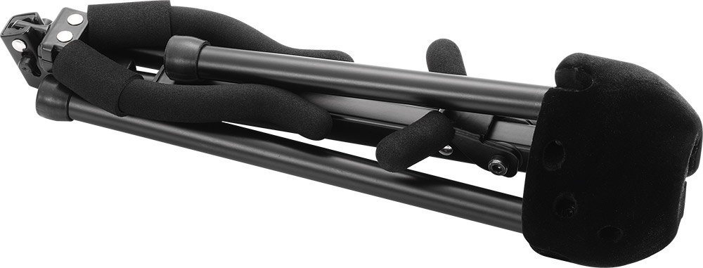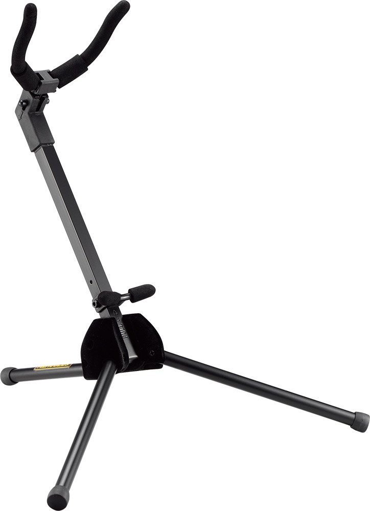 The HERCULES TravLite Alto Saxophone Stand DS431B folds easily and compactly and stores inside the bell of the instrument; velvet pads protect the instrument.