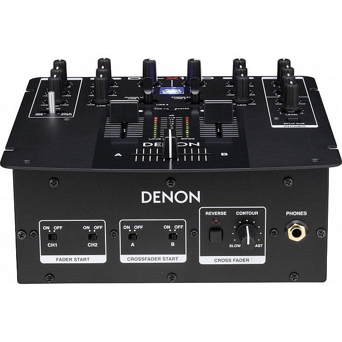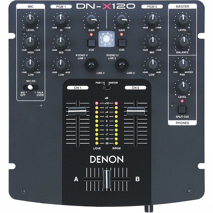 The DN-X120 is a companion mixer for Denon's DN-S1200 Media Player and Controller is a fairly straightforward piece of equipment. As for controls, it has a 3-band EQ with a Full Kill option, VCA, 45mm crossfader & channel faders, Mic Talkover switch, split cue, fader start, a 4 position Input/Transform switch, and a 2-band EQ for the mic input. The I/O includes TRS balanced & RCA unbalanced L/R stereo outputs, line and phono/line (switchable) inputs, and a mic input. It also has it's own external power adaptor.