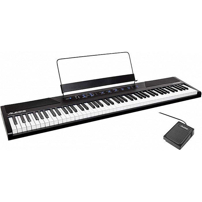 The Concert 88-Key Digital Piano with Full-Sized Keys from Alesis is a full-featured digital piano with 128-note polyphony, semi-weighted keys, adjustable touch response, and a built-in 20W speaker system. It features 10 built-in voices: acoustic piano, bright piano, electric piano, harpsichord, drawbar organ, church organ, synth, strings, bass, and clavi. The keyboard can be used to customize the voices by combining any two sounds in layer mode or by assigning to the left or right hands in split mode. In addition, it features adjustable reverb and chorus to further tailor your sound and delivers a great playing experience for the beginner student and the intermediate or professional musician. Furthermore, this keyboard features stereo RCA outputs to connect to a recorder, mixer, amplifier or other sound system. The USB-MIDI output connects you to a computer for using educational software or virtual instrument plug-ins. This digital piano is provided with a sustain pedal, and the keyboard can be powered using the included power supply or six D-cell batteries (not included).