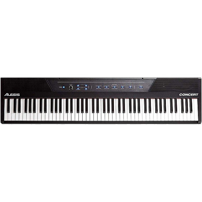 The Alesis Concert is an affordable, easy-to-play digital piano featuring 88 full-size, semi-weighted keys with adjustable touch response and 10 vibrant voices: Acoustic Piano, Bright Piano, Electric Piano, Harpsichord, Drawbar Organ, Church Organ, Synth, Strings, Bass, and Clavi. You can customize the voices by combining any two at once in Layer Mode for a full, rich tone, or you can assign voices to just the left or right hands in Split Mode. Add some tasty reverb and chorus to further enhance your sound. With built-in, 20-watt speakers and 128-note polyphony, the Alesis Concert delivers lush, realistic sound and a satisfying playing experience. Whether you’re a beginner or a more experienced pianist, you’ll appreciate the realism of the Concert’s expressive Pedal Resonance, 128-note polyphony, keyboard Split and Layer modes, built-in metronome, reverb and chorus effects, USB MIDI output, and adjustable touch response, which lets you tailor the feel of the keyboard to your preferences.