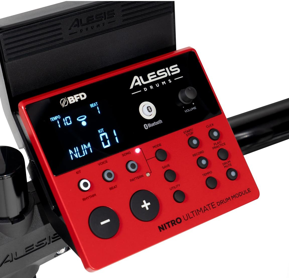 The appropriately named Alesis Nitro Ultimate drum module represents nothing less than Alesis's finest Nitro module to date. Powered by the robust BFD Player (and featuring the free Dark Mahogany expansion pack), the Nitro Ultimate module sports 36 preset kits, and you can select from more than 640 sounds to create 16 custom user kits for a total of 52 kits. The always convenient integrated Bluetooth means you can start jamming along with songs or listening to your new Drumeo lessons from day one. Finally, using MIDI via USB connectivity, you can run your Alesis Nitro Ultimate kit through your favorite drumming software for unlimited sound and recording options. Already experienced with acoustic kits? You'll love the feel and playability of the Nitro Ultimate electronic drum set. And, if you plan on playing an acoustic kit in the future, then the Alesis Nitro Ultimate helps make your transition as seamless as possible.