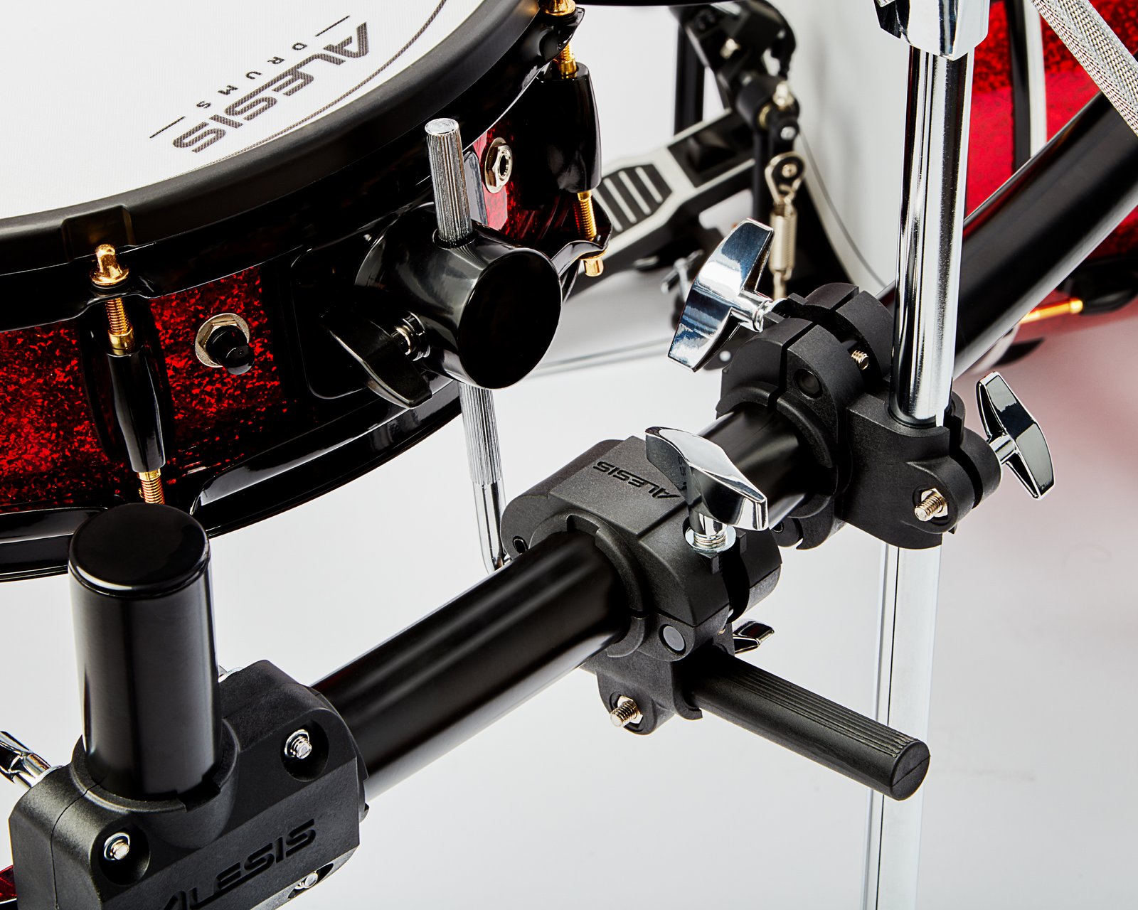 However, there is far more that makes the Strike Pro Special Edition an extraordinary playing experience than just the full-sized kick. To begin with, the Strike Pro Special Edition utilizes all-new latest-generation mesh heads, dual-zone for the snare and all the toms. Their response is faster, more natural and easier-playing than ever before. You will fly over these heads, effortlessly laying down powerful grooves and snapping off crisp fills. These heads won’t fight you; instead, these new Alesis mesh heads are your best ally.