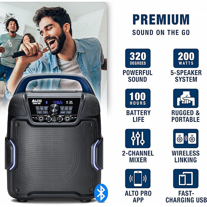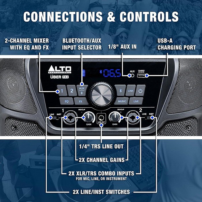 With Bluetooth 5.0 wireless technology, the Uber FX MKII lets you stream audio from any Bluetooth-enabled device like a phone, tablet or laptop. You can play tracks for backing music or audio playback without cables getting in the way. For complete wireless control, use the Alto Pro app to adjust parameters in real time from anywhere in the venue. You can also wirelessly link two Uber FX MKII units to instantly create a stereo PA system using your favorite music streaming app.