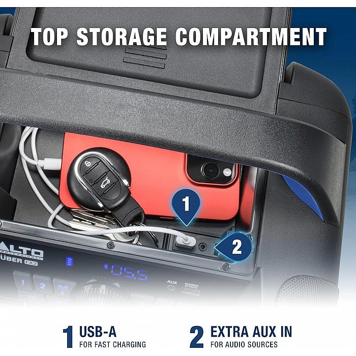 The Uber FX MKII is designed for ultimate portability to take your sound anywhere. It features a telescoping handle and heavy-duty wheels for easy transport. The top compartment provides handy storage space for mics, cables and accessories. Little extras like a bottle opener, front panel lighting and USB charging ports make it even more convenient. Plus, with up to 100 hours of battery life, you don't need to worry about AC power. The Uber FX MKII portable PA speaker pair delivers powerful, wireless sound for events and performances on the go.