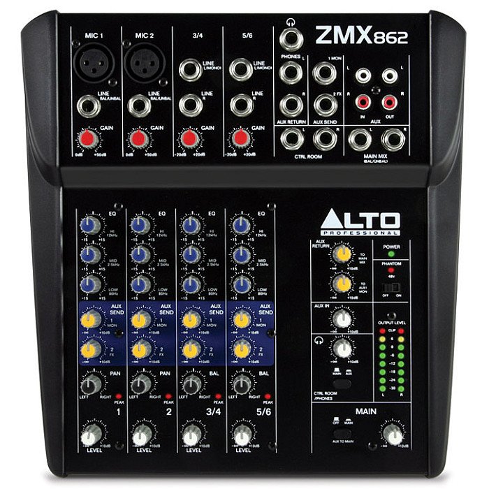 In a market that has a glut of small format mixing consoles, the Alto ZEPHYR ZMX862 is an excellent option. Its combination of low price, good build quality and smartly designed feature set has made it a real leader in a very competitive category. The ZEPHYR ZMX862 is a 6-channel, 2-bus mixer with two phantom power-equipped microphone inputs, a three-band EQ and two AUX sends on each of the two mono channels and on the two stereo channels, and two-track inputs for audio playback.