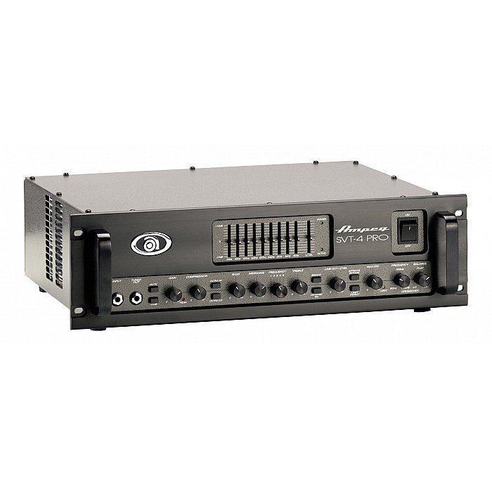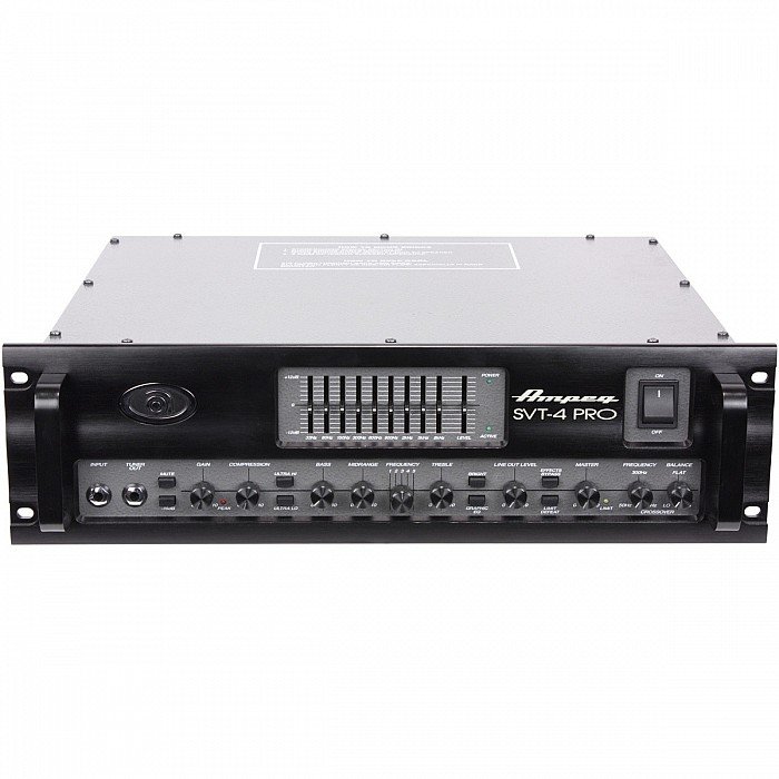 The Ampeg SVT-4 PRO Series Bass Head gives you lots of tonal control and lots of power. This true hybrid features a 3-tube preamp, a Mos-Fet power amp that delivers 1,200W into 4 ohms, tone-shaping tools, and all the Pro features you'll ever need. For tone control you get 3 tone controls, a 5-position mid switch, a 9-band graphic, and ultralow/high boosts. It also features a defeatable optocoupler limiter, a variable 0-7:1 compressor, an internal 24dB/octave crossover, a 50Hz-1kHz crossover point, high/low balance control, tuner out/mute function, 1/4" biamp outputs, 2 balanced line outs with transformers, 2 effects loops, and 2 preamp out/power amp ins. It gives you classic SVT tone and more.