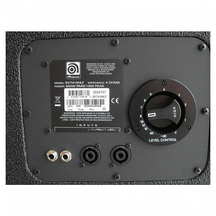 The Ampeg SVT-410HLF Enclosure gives you plenty of volume and clean low end. This 4x10" cabinet has the same speakers and 1" horn as the SVT-410HE with 2" coils and 30 oz. magnets, but the cabinet itself is tuned differently. It's deeper and has a bottom port that results in better low-end response, down to 28Hz!