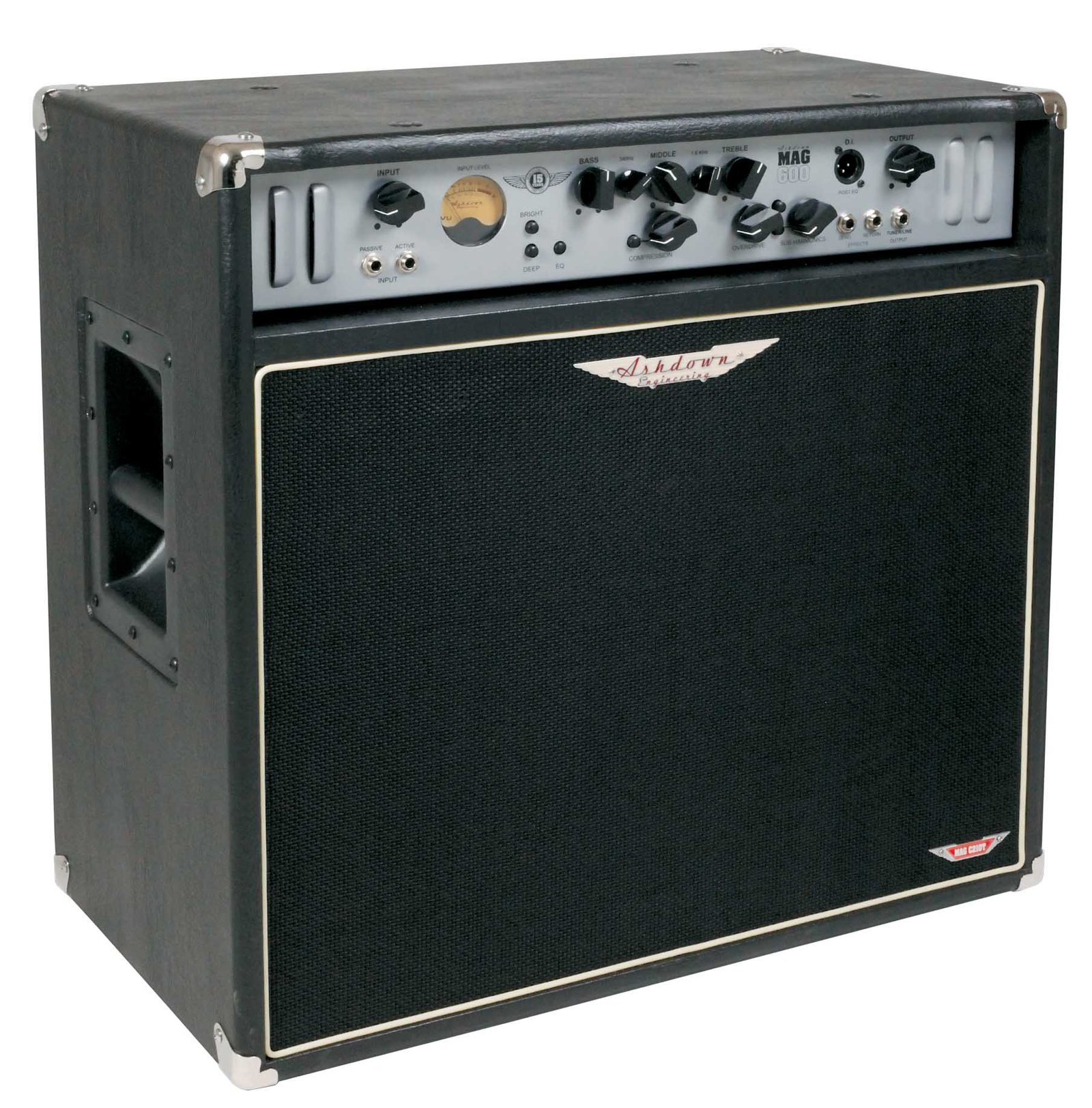 At the heart of the MAG C210T-300 EVO III combo lies a feature-packed bass preamp with rotary bass, middle and treble controls, along with supplementary rotary controls providing 15dB of cut and boost at 220Hz and 1.6kHz. Additionally, front panel push switches for Bright and Deep settings provide instant access to attacking and warm, rounded sounds respectively and, on the subject of low-end response, the trademark Ashdown sub-harmonic generator is ready and able to deliver truck loads of earth moving tone if called upon.