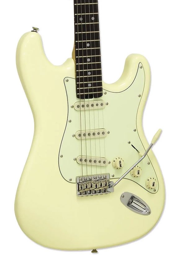 A marriage of the tradition and modern aspect. Aria Pro II Modern Classics offer a vintage feel with an advantage of contemporary functions. STG-62 features alder body with multi layered mint green pickguard and vintage style synchronized tremolo bridge. Alnico V single coil pickups bring pure organic tone. Spoke wheel truss rod is employed to offer smooth and easy neck adjustment while it is still bolted on.