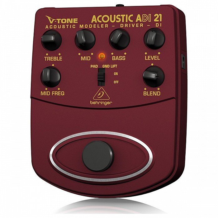 By their very nature, piezo pickups tend to be very bright, with somewhat reduced bass response and warmth. The ADI21 combines the features of an active DI (direct injection) box with Behringer's proprietary microphone/tube emulation. If you don't want to use the emulation feature, the ADI21 also functions as a superb active DI box. The Blend control allows you to mix the amount of modeled tone with your instrument's normal output. The resulting sound is more natural with smooth saturation.