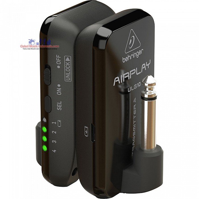 The Behringer Airplay Guitar ULG10 is a high-performance, low-latency 2.4GHz wireless guitar system with an integrated 750 mAh rechargeable lithium-ion battery for operation of up to 6.5 hours. The transmitter and receiver's plastic enclosures each feature an adjustable 1/4" TS connector, which allows each enclosure to be plugged into your guitar and amplifier, respectively. The side of the unit offers four LEDs indicators, representing battery status and channel selection.