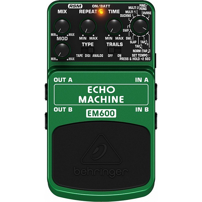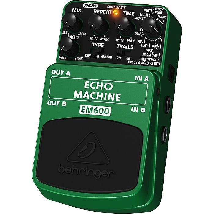 The Echo Machine is essentially 11 delays in one pedal: Ping Pong, Reverse, two different multi-delays, Tracking, Sweep, Swirl, Slap and three different tap modes. BEHRINGER Real Sound Modeling technology gives this pedal the ability to emulate the acoustics of a variety of environments. Produce realistic cathedral-like echo in your bedroom or cave-like echo at the corner bar. Real Sound Modeling makes it possible!