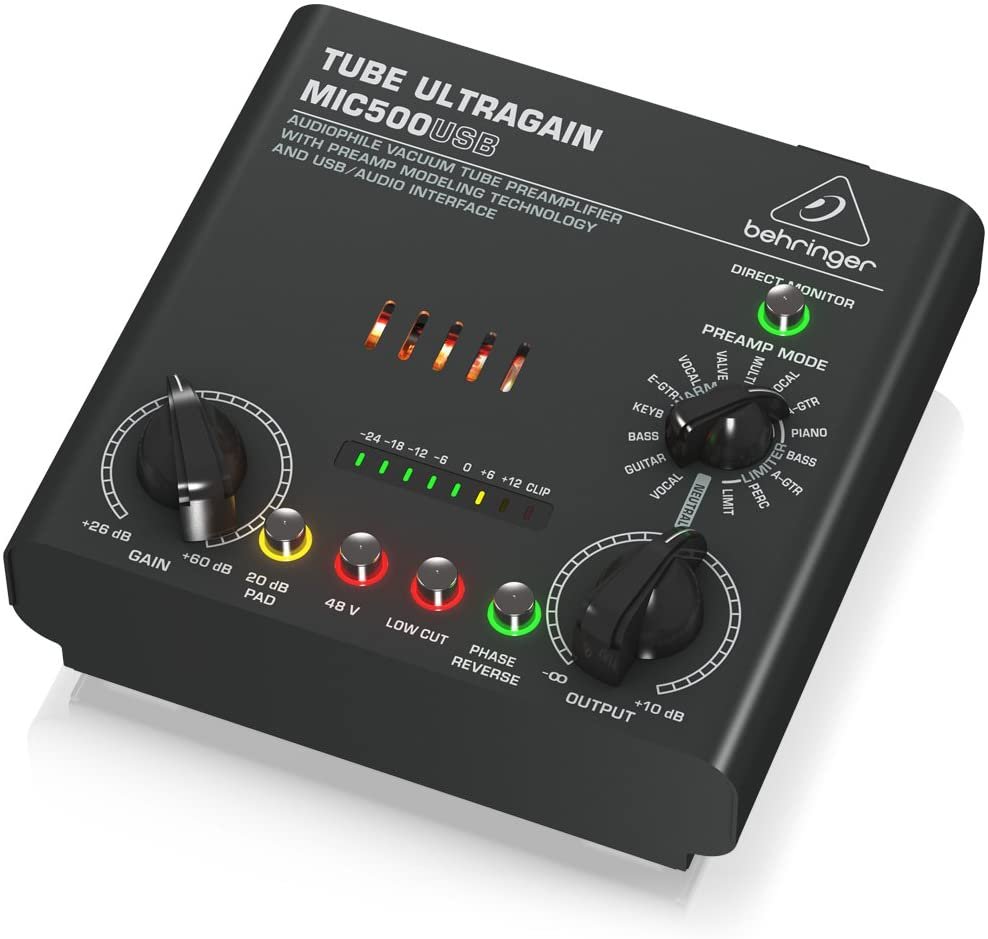 You don't have to spend big bucks to get high-quality preamp tone. Designed and engineered in Germany, Behringer's MIC500USB Audiophile Vacuum Tube Preamplifier affordably delivers high-end, tube-driven pre-amplification for all microphone, instrument, and line-level sources. The MIC500USB uses a hand-selected 12AX7 vacuum tube for exceptional warmth with a very low noise floor. You get balanced inputs and outputs on 1/4" TRS and XLR connectors, 48-volt phantom power, a phase reverse switch, and 20dB Pad for the utmost flexibility. Need more? The MIC500USB provides 16 preamp voicings through its built-in USB/audio interface and free audio recording software with 150 instrument/effect plug-ins that are downloadable directly from Behringer's site.