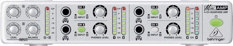 The Behringer MiniAmp AMP800 4-channel headphone amplifier is an easy and low-cost way to power up to eight sets of headphones. Each headphone channel supports two sets of headphones and gives you the choice of two input sources, with pan and input level control over each source. And if you need to power more than eight sets of phones, use the parallel link output to cascade your source signals to an additional headphone amp. If you need to power multiple sets of headphones without sacrificing control over your audio, you can't go wrong with the Behringer MiniAmp AMP800 headphone amplifier.