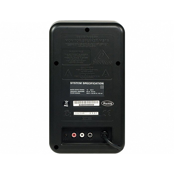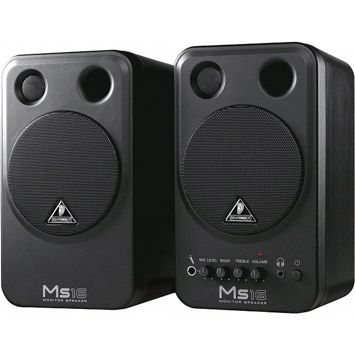 The Behringer MS16 is a compact 2-way stereo speaker system for home studio or multimedia applications. Eight watts drive the MS16's 4" woofer and high-resolution tweeter, while a front-mounted volume control and individual bass and treble controls make accurate sound adjustments a breeze. Two stereo line inputs (RCA and 1/8 TRS) allow simultaneous use of two stereo sources, so you can play back CDs, MDs or MP3s and use an electric guitar/keyboard at the same time. In addition, the TRS microphone input lets you mix vocals with a stereo track. Magnetic shielding and compact size make the Behringer MS16 ideal for placement near video monitors or computer displays.