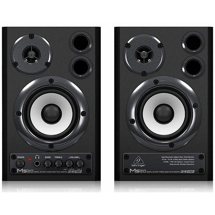 When you need a compact pair of desktop speakers, the Behringer MS20 monitor speakers are a smart solution. They're perfect for multimedia production, gaming, watching videos, and playing keyboards. The sound is clear and detailed thanks to the two-way design powered by 10 watts, and the bass response is enhanced by the ported cabinet. You can even enjoy hi-res digital audio thanks to 24-bit/192kHz digital inputs. And with a built-in mixer for multiple input sources, you won't be constantly plugging and unplugging things from your Behringer MS20 monitor speakers.
