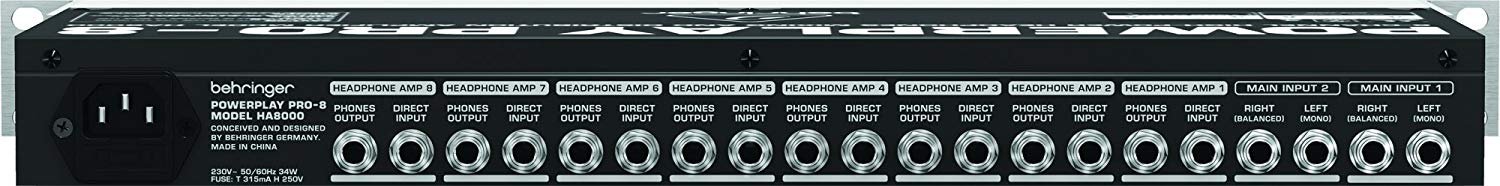 Expand your headphone setup with the Behringer HA8000v2 Headphone Mixing/Distribution Amplifier. The HA8000v2's main input features two stereo inputs for two independent mixes, which are selectable for all outputs. You can create separate mixes, choose who listens to what, and choose the levels. The HA8000v2 features an LED output meter, Main 1 and Main 2 switch, plus a Mono/Stereo switch and level control on each channel. From the back of the headphone amp each channel has an extra headphone output and a direct input for adding instruments and vocals.