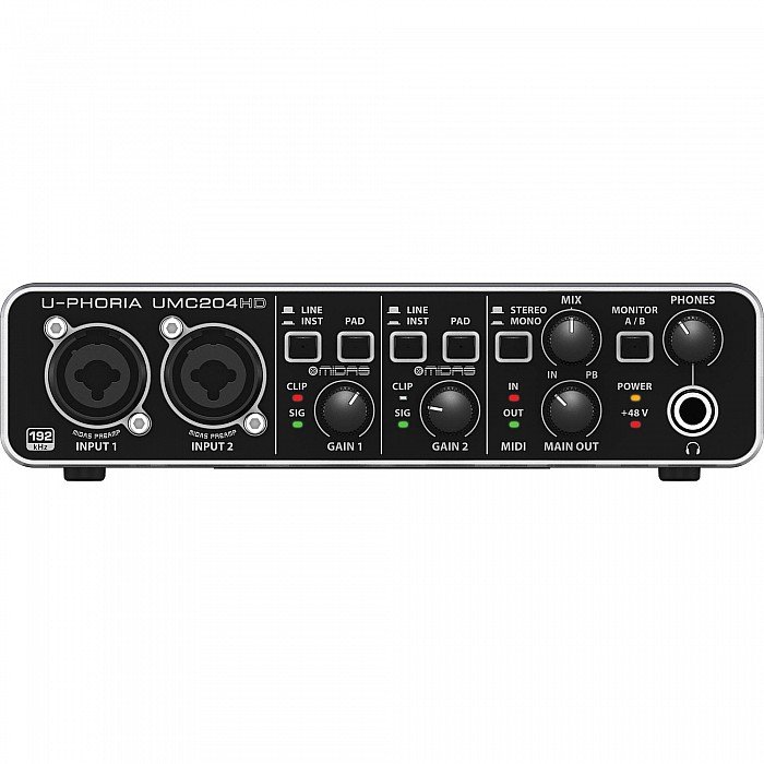 One of the things that really makes the Behringer U-Phoria UMC204HD USB 2.0 audio interface stand out is its genuine MIDAS preamplifier technology. Known throughout the world of live sound for delivering ultra clear sound with plenty of headroom, MIDAS preamps are among the most popular mic pres on Earth. What's more, these preamps come standard with +48V phantom power onboard, so you can use your choice of quality condenser microphones with your U-Phoria UMC204HD.