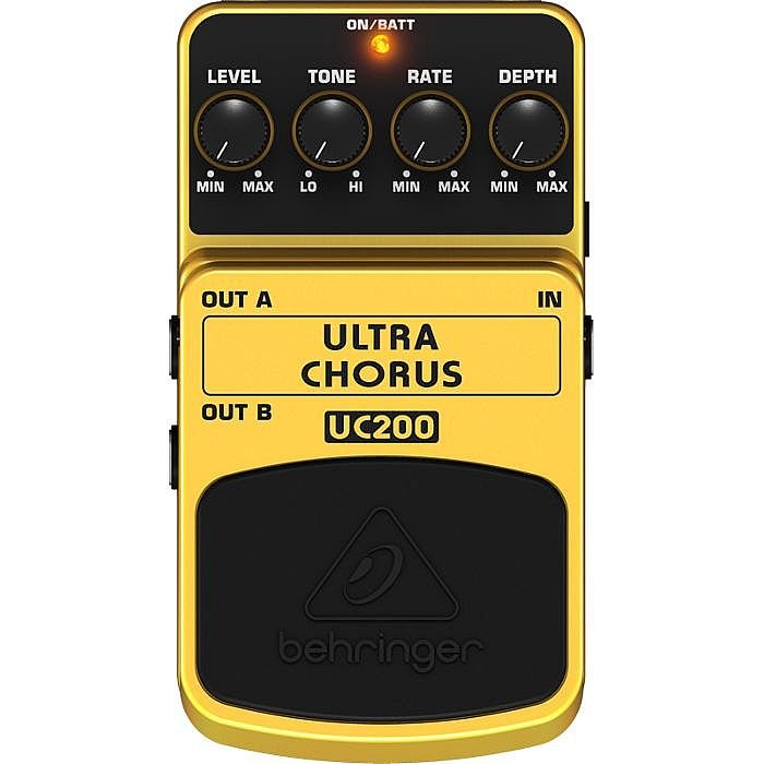 Guitarists know you've got to have a chorus pedal in your effects chain. The Behringer Ultra Chorus UC200 is an affordable option that gives you super-thick chorused tone with a rich stereo effect. You shape your sound with dedicated Level, Tone, Rate and Depth controls. A blue status LED serves as an indicator for effect on/off and battery check, while the rugged electronic on/off switch preserves your signal integrity. The UC200 runs on a 9 V battery or a DC power supply (not included).