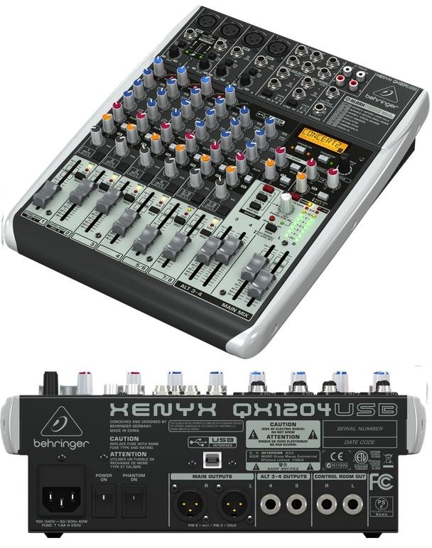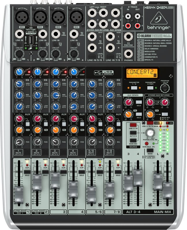 The Xenyx QX1204USB is a 12-input, 2/2-bus mixer with Xenyx mic preamps and compressors, a USB audio interface, and a wireless option. It's fitted with Behringer's "British" 3-band EQ and, 60mm log-taper faders, and sealed rotary controls. But the icing on the cake is the onboard Klark Teknik FX processor with 100 killer presets. Flexible routing, including two aux sends per channel and two subgroups with separate outputs, makes for easy integration into your setup, while the Xenyx QX1204USB's onboard USB port gives you effortless connection to your computer for recording.