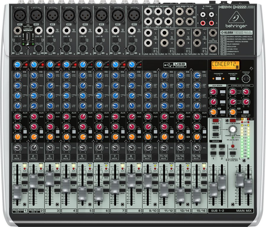 The feature-packed XENYX QX2222USB mixer allows you to effortlessly achieve premium-quality sound thanks to its 8 onboard studio-grade XENYX Mic Preamps and ultramusical “British” channel EQs – with a semi-parametric mid band for warm and musical sound. And our easy-to-use “one-knob” compressors provide total dynamic control for the ultimate in punch and clarity, while respecting all the power and emotion you pack into every note. Add to this our KLARK TEKNIK FX processor with 32 studio-grade presets with dual addressable parameters, Tap function and storable user parameter settings – and the QX2222USB becomes an incredibly versatile mixer for your live performances.