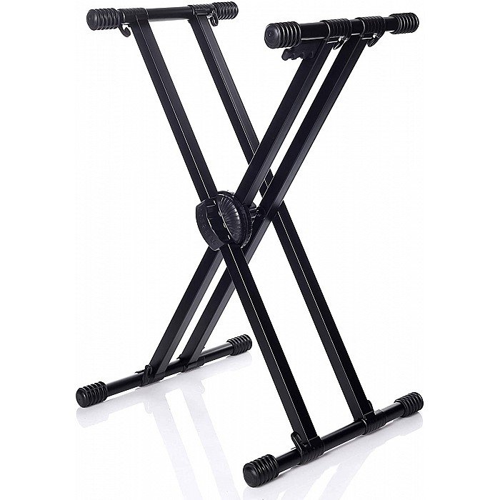 Professional double braced keyboard stand. Equipped with a "squeeze grip" handle on the top tier for easy adjustment in 5 convenient height positions. This stand has heavy duty 30 mm tubing and 4 leveling footcaps in natural rubber to compensate for uneven floors. Complete with 4 hooks for cables management. This stand is functional and efficient in its design, it ensures the highest stability. Height: min 48 cm, max 98 cm. Opening: min 25 cm, max 88 cm. Max carriage capacity: 40 kg. Weight: 6,25 kg