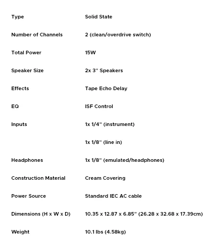 Patented ISF (Infinite Shape Feature) control so you can dial in any tone. Unique 'tape' echo effect built-in makes playing a pleasure.