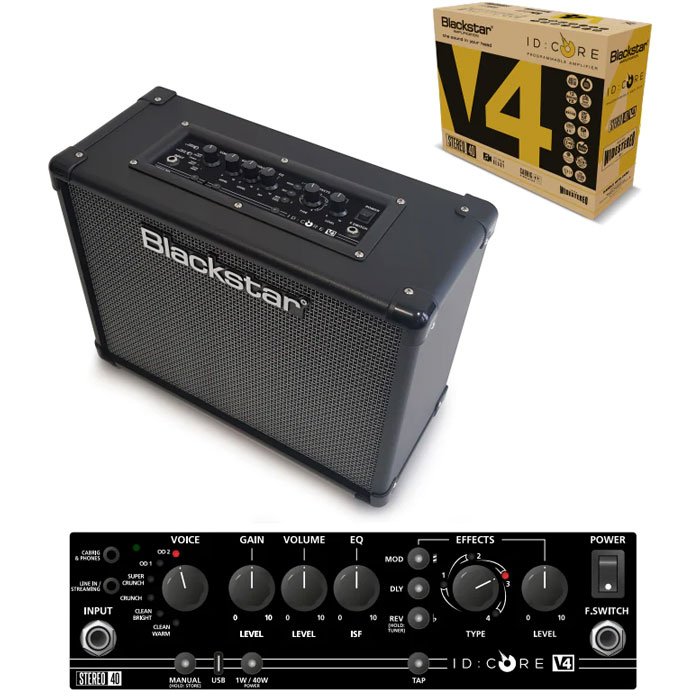 A sleeker editor, a powerful new cab simulator, and even more-immersive stereo effects make the third generation of Blackstar's ID:Core 40 combo the ultimate practice amp and an essential single-handed session tool. Choose from six inspiring amp voices that run the gamut from classic cleans to scorching leads. Dial in the perfect blend of American and British character with Blackstar's patented ISF control. Add gloss and dimension to your playing with built-in modulation, delay, and reverb effects as Blackstar's Super Wide Stereo technology envelops you in immersive sound. There's even an onboard TRRS Line In/Streaming jack so that you can film guitar covers and capture performances directly onto your phone using sounds from the amp. The Blackstar ID:Core 40 V4 might be the ultimate practice amplifier for beginning guitarists. Choose from six inspiring amp voices that run the gamut from classic clean to saturated overdrive. Dial in the perfect blend of American and British character with Blackstar’s patented ISF control. Add gloss and dimension to your playing with built-in modulation, delay, and reverb effects, while Blackstar’s Super Wide Stereo technology envelops you in immersive sound. Jam along to your favorite tunes via a re-voiced MP3/Line Input. Edit and store your favorite patches with the included Insider app.