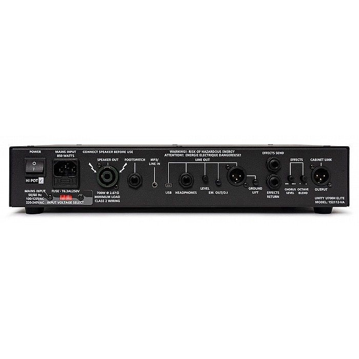 The Unity Elite 700w head packs all the pro features needed for the working bass player including the Response control (Linear, 6L6, 6550), Compressor, built-in effects, Chorus, Octaver and 3 types of Overdrive, market-leading tonal flexibility from dynamic clean, through valve growl to full-on distortion which are all footswitchable.