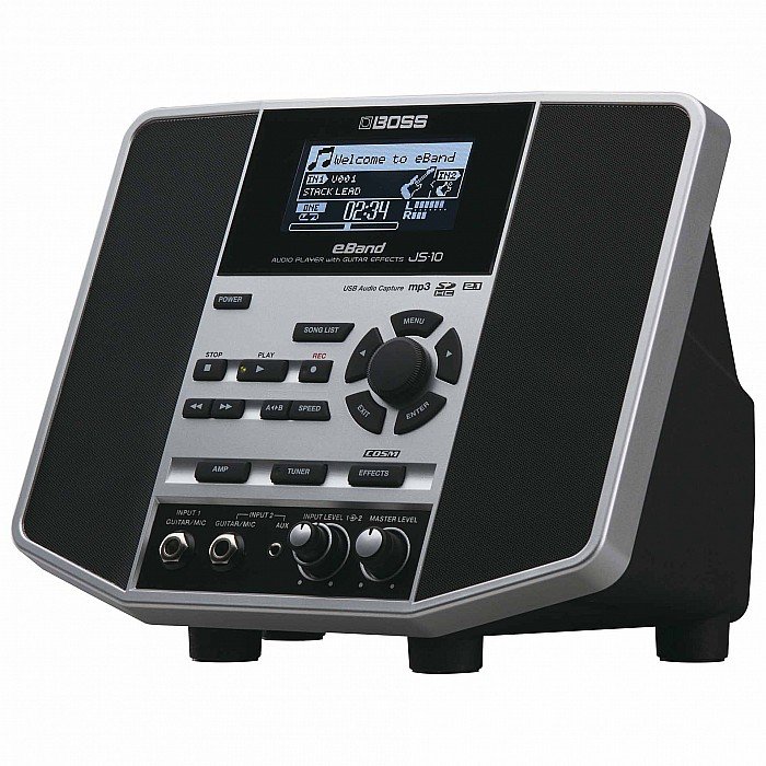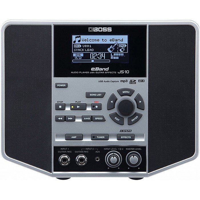 Grab your guitar or bass and microphone, plug into the Roland eBand JS-10, and amaze your friends, family, and fans! The eBand JS-10 is self contained and small, but fills the room with full-range sound from its 2.1 sound system and pro BOSS effects. Jam with a large selection of onboard song tracks and audio loops, and add your own library of favorite songs to play along with via USB or SD media. You can easily change the tempo and key signature of the songs with high-quality results, and record your performances, too. eBand is the compact, all-in-one jam station packed with pro features and larger-than-life sound.