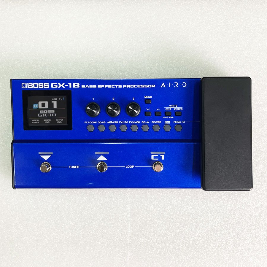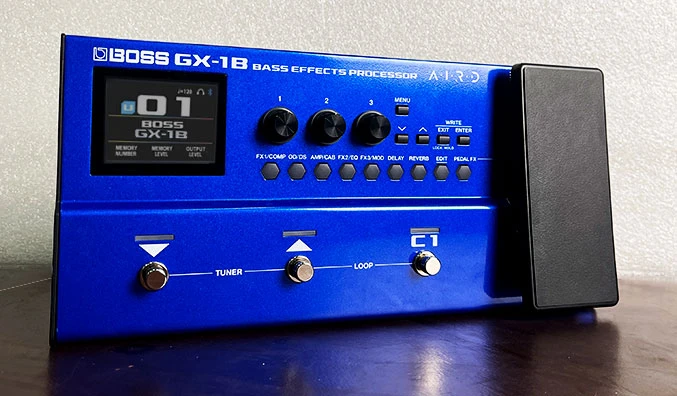 The Boss GX-1B is a multi-effects bass processor from Boss. It's a comprehensive device that combines a wide variety of effects (such as overdrive, compression, delay, etc.), amplifier simulations, and other features. It's designed for bass players who need flexibility and high-quality sound in one portable unit. It's often part of the GT-1B line or other bass series that offer complete sound shaping for electric bass, such as https://www.boss.info/id/products/gt-1b/, which has similar features.