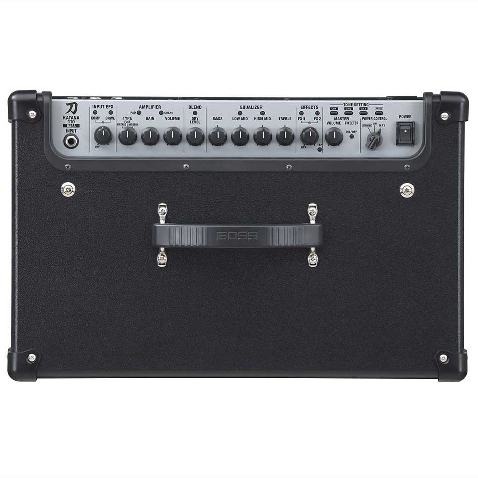 The Katana 110B features all new, original bass tones, courtesy of a proprietary Class A/B power amp system. Easily switch between Vintage, Flat and Modern amp types for classic "valve" and modern, progressive bass tones with rich dynamics and play feel. A 4-band EQ section allows you to tweak your tone to your liking with controls for bass, low mid, high mid and treble, in addition to the gain and volume controls. Boss' powerful bi-amp system powers the speaker and tweeter independently, ensuring crystal clear tones with no tone loss, regardless of volume. This means you'll sound just as good at home as you do on stage!