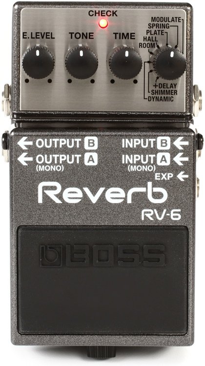 We quickly discovered that the BOSS RV-6 is a great way to add reverb to your pedalboard. It's as easy as selecting a sound mode and tweaking a few knobs. The RV-6 takes advantage of cutting-edge technology to provide you with eight sophisticated, highly musical reverb effects that range from room, hall, and plate algorithms to vintage-style spring reverb to immersive, modern-sounding textures. Plus, Dynamic Mode automatically adjusts to your playing for lush ambience that won't turn your tone to mud. The BOSS RV-6 comes complete with auto-switching for easy integration into your rig, an expression pedal input, and a superb-sounding analog signal path.