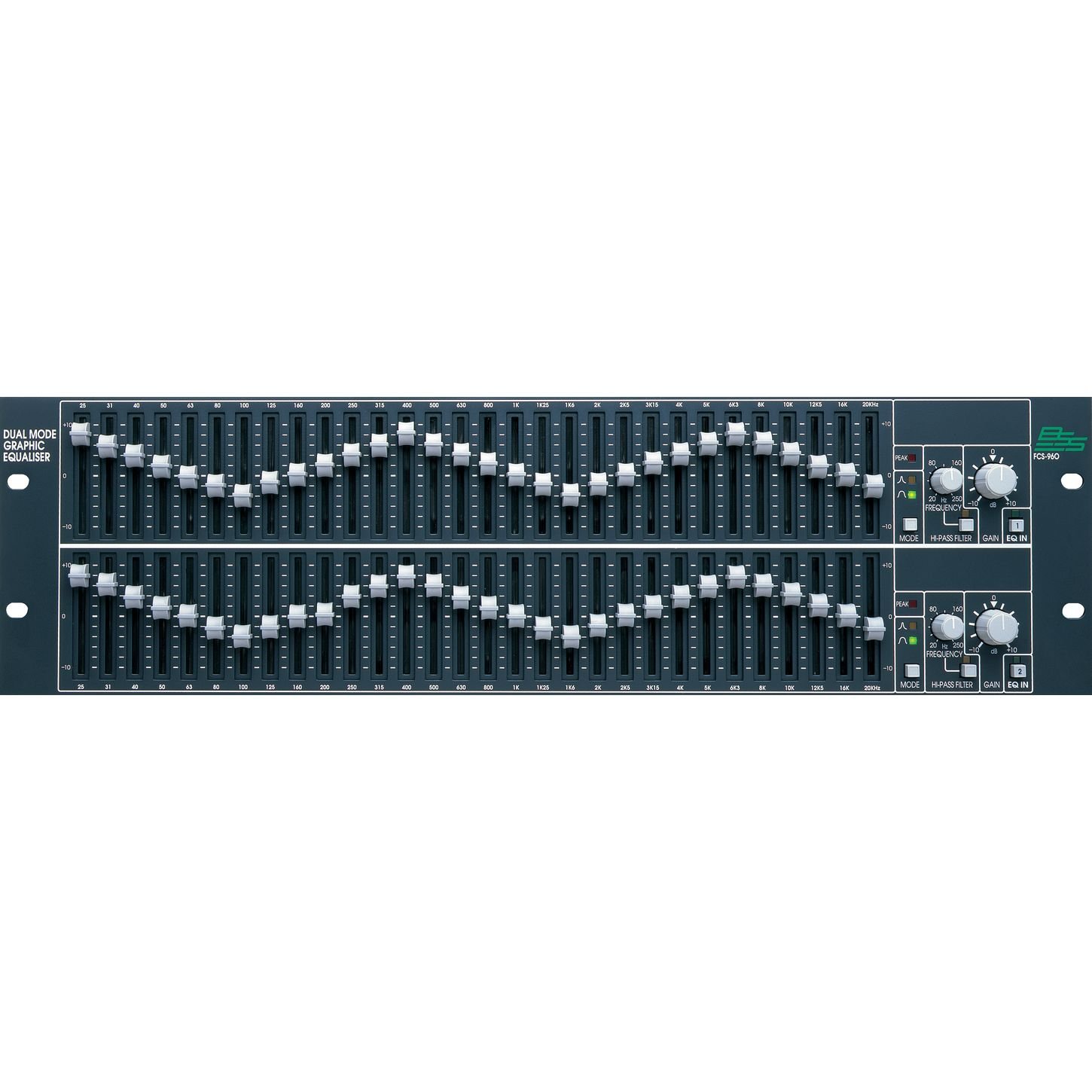 The BSS Audio FCS-960 is a 30-band graphic equalizer featuring Dual Mode switching between Normal and Fine filter width settings on each channel. The FCS-960 provides 2 channels in 3U of rack space. Constant Q-filters with filter-bypass center taps are controlled by high grade, 45mm faders with molded polymer fader knobs that eliminate visual parallax error even under low light conditions. Also included are sweepable/switchable Hi-pass filter, Gain control and electronic balanced inputs and outputs.