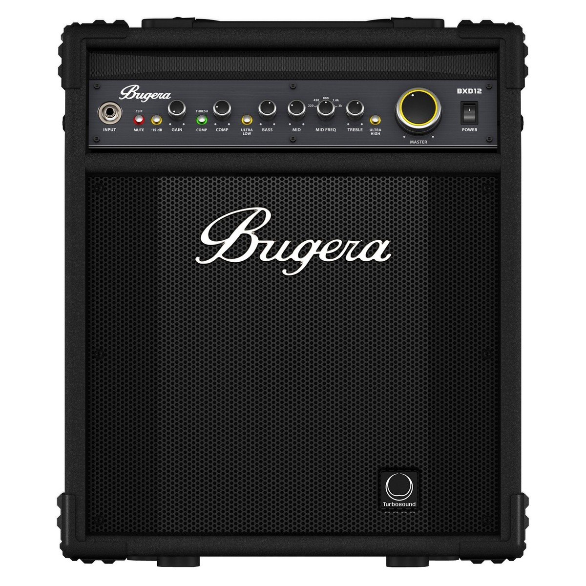 Huge power and light weight are great features, but there's so much more to the Bugera BXD12 bass combo amp. The passive Gyrator circuitry with tube-inspired sound gives you authentic tone, and a selectable mid-frequency switch conjures five classic sound variations so you shape the sound for your particular playing style. And there are switchable ultra-low and ultra-high functions that add bass or treble boosts respectively. We know compression, and we know you'll appreciate the compression options included in the Bugera BXD12 bass combo amp. The studio-grade compressor provides transparent, musical compression gently engages and smooths out peaks for the ultimate tone. But it doesn't stop there, as Bugera built in special Dynamizer technology that further enhances your tone. What is this Dynamizer and what does it do? Think of it as parallel compression, like that used in the studio for years. You signal is split into two discrete signals: a dry version and a heavily compressed version. The Dynamizer recombines these separate signals, giving you the ability to get the most out of your tone! You get big power and tons of tone and feature with the Bugera BXD12 bass combo amp!