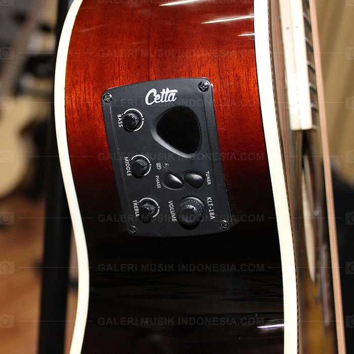 The new guitar variant from Cetta Guitar, adds to the quality choices made in Indonesia. Indonesian people's favorite junior acoustic guitar, Cetta CJ18E. This guitar is specifically designed for easy portability. In addition, we chose the size of the guitar body that is not too small. So that the resulting natural sound remains good. By using Indonesian mahogany on the top, back and sides, the sound character produced is warmer (lower) and tends to sound softer. The electronic part is supported by the KLT 18 A pre-amp, so we often refer to this guitar as a "grab and go guitar". No more worries when carrying it, wherever and whenever.