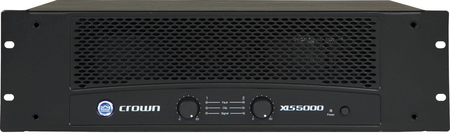 The Crown XLS 5000 delivers 1800 watts per channel in four-ohm stereo mode, and a staggering 5000 watts in four-ohm bridge-mono mode. Housed in a rugged, 3U, all-steel chassis, the highly reliable XLS 5000 is equipped with an efficient forced-air fan to prevent excessive thermal buildup. The front panel sports dual precision-detented rotary level controls, a power switch with accompanying LED, and six additional LEDs indicating signal, clip, and fault for each channel. Rear panel connections include two electronically balanced XLR inputs as well as touch-proof binding post and Speakon outputs.