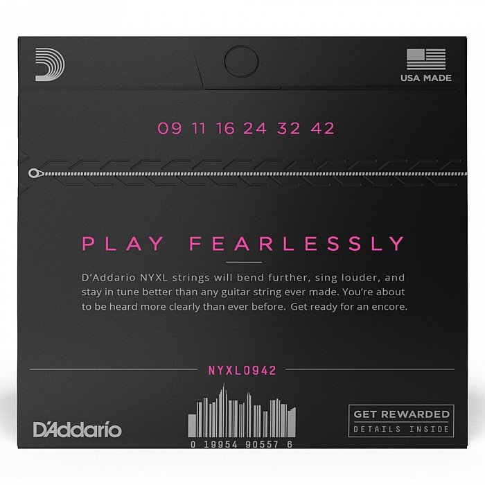 So, what really makes NYXLs so much different than standard D’Addario strings? First, they’re built with an exclusive high-carbon steel core wire for greater durability and a higher tolerance for alternate tunings. The other difference found on NYXL strings is the reformulated nickel-plated wrap wire, which delivers a subtle boost in output between 1kHz and 3.5kHz. With NYXL strings, you get a modernized sound and ferocious durability without sacrificing the easy playability you know and love. D’Addario NYXL electric guitar strings will bend farther, sing louder, and stay in tune better than any string you’ve played before. Envisioned, perfected, and manufactured by D’Addario in New York, this precision-engineered, break-resistant, high-carbon steel core and plain steel alloy delivers a whole new level of freedom, confidence, and power.