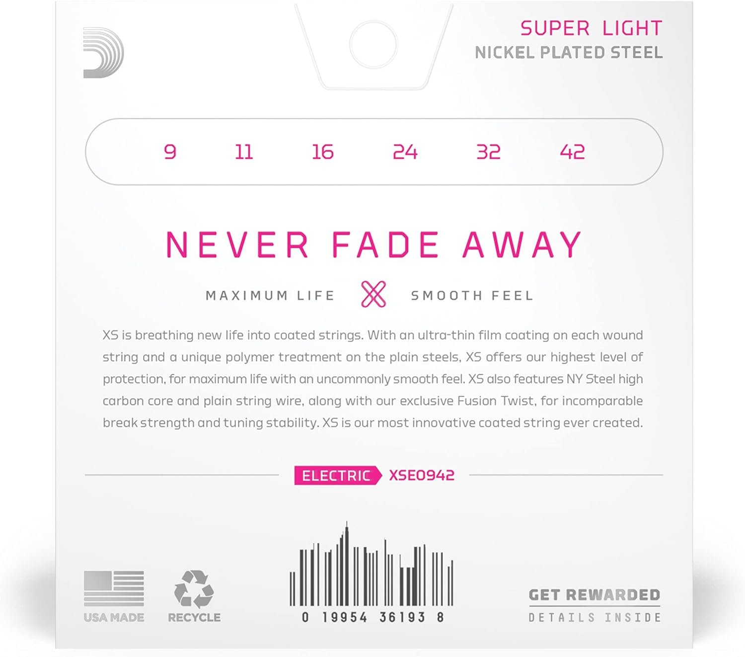D'Addario XS sets aren't your ordinary coated guitar strings. Both the wound strings and plain steels feature groundbreaking thin film coatings. This eliminates that awkward stage common to other coated strings where your bottom strings far outlast your top strings. XS Nickel coated electric guitar strings provide the longest life of any D’Addario electric guitar string. Coated with our groundbreaking XS coating, these premium electric strings attain maximum life and a smooth, fast feel without dampening their outstanding tone. Constructed with a NY Steel core, reformulated nickel-plated steel wrap wire, and Fusion Twist technology, XS Nickel strings boast superior strength and tuning stability, plus richer harmonics, greater clarity, and remarkable definition with every sweep, slide, and bend. This 9-42 Super Light gauge set is easy to bend and very flexible.
