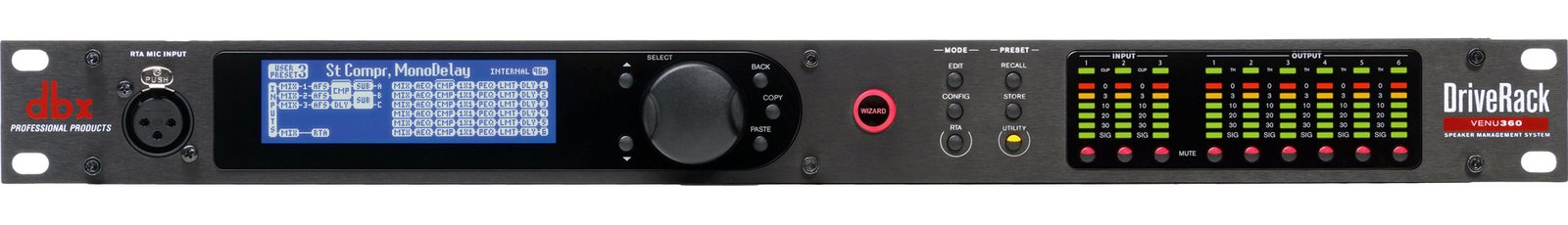 The VENU360V gives you professional-level processing power by providing essential loudspeaker tuning tools. With the latest in dbx processing including their most accurate AFS (Automatic Feedback Suppression) ever, AutoEQ and Level Assist functions with front panel RTA mic input, graphic and parametric EQs on both the inputs and outputs, compression and other dynamics processing, time delay functions, and bass-bumping subharmonic synthesis, you get all the power you'd usually find in two racks full of gear in one VENU360V