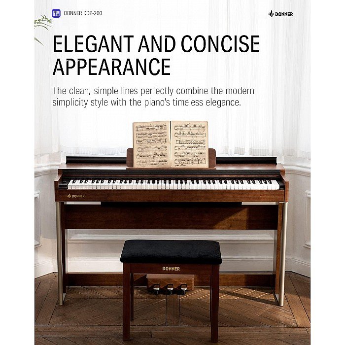 The new design of the speaker system has a flat base and offers you a great looking and sounding piano that fits into your home. Attractive wood grain finish: The Donner DDP-200 88-key digital piano features an attractive wood grain finish and rich dark oak colours. The incredibly lightweight, luxurious home style is easy to combine with contemporary interior design. It is a lightweight, expensive and attractive musical instrument while also being a beautiful piece of furniture.