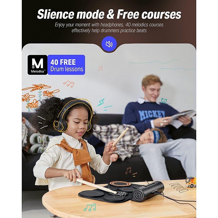 Donner electronic drum pad is made of high-quality soft silicone, which can reduce the noise when drumming. It supports a 3.5mm headphone output, you can wear a set of headphones to improve your technique without disturbing your family, roommates, or neighbors. It is so easy to store that you can roll it up, and pack it in your bag. Come with standard midi out jack and USB midi out jack, you can connect the drum to computers to produce music or play games, or connect external speakers for family entertainment/birthday parties. Perfect for adults who need MIDI functionality and children for entertainment.