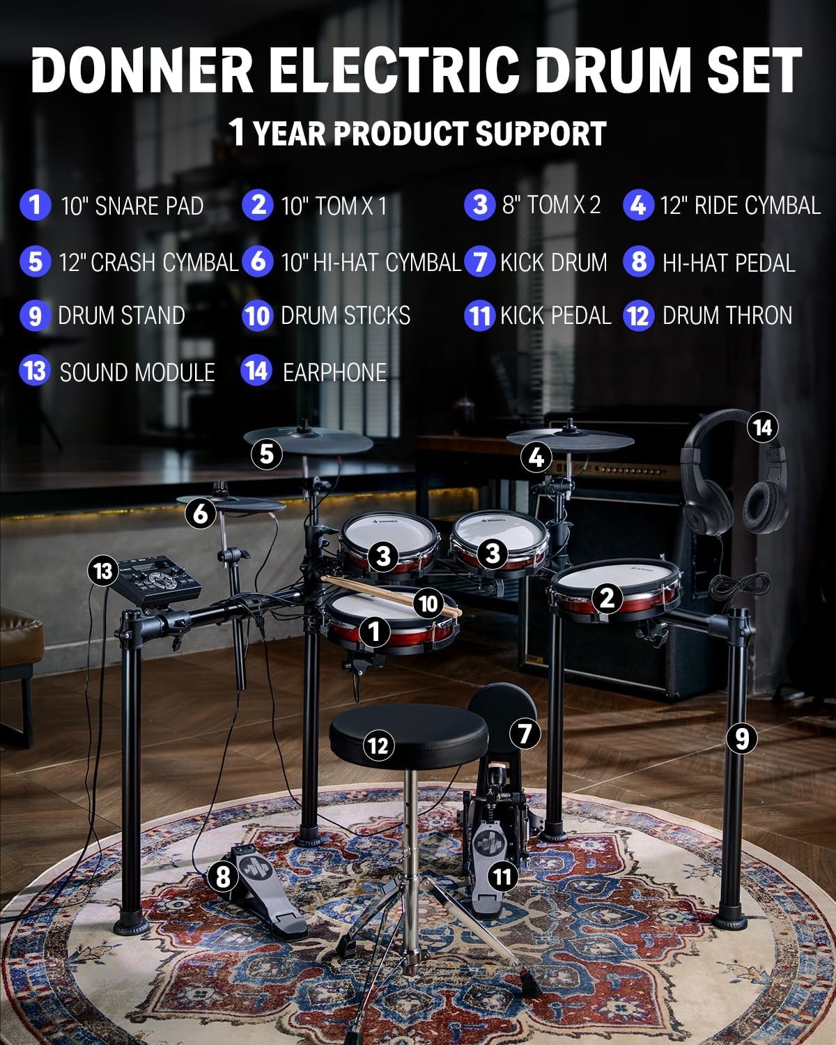 The DED-200 MAX electronic drum kit emulates the real drum shell and genuine metal drum hoops, offering a superior visual experience and user feel. The Next Level 2-ply Mesh Drumhead feels great and the dynamic tracking is spot on with long lasting power. The DED-200 MAX electronic drum kit emulates real drum shells and metal hoops, offering a superior visual experience and user feel. The DED-200 MAX electronic drum kit emulates real drum shells and metal hoops, offering a superior visual experience and user feel. With precise sampling of real drums, the electronic drum kit offers 450 sounds and 31 classic and modern drum kits that are more than enough to deliver exciting performances. Everything you need is included: foldable metal stand with stable and secure 4-post aluminum rack, hi-hat control, bass drum pedal, headphones, drum chair, audio cable and drum sticks.