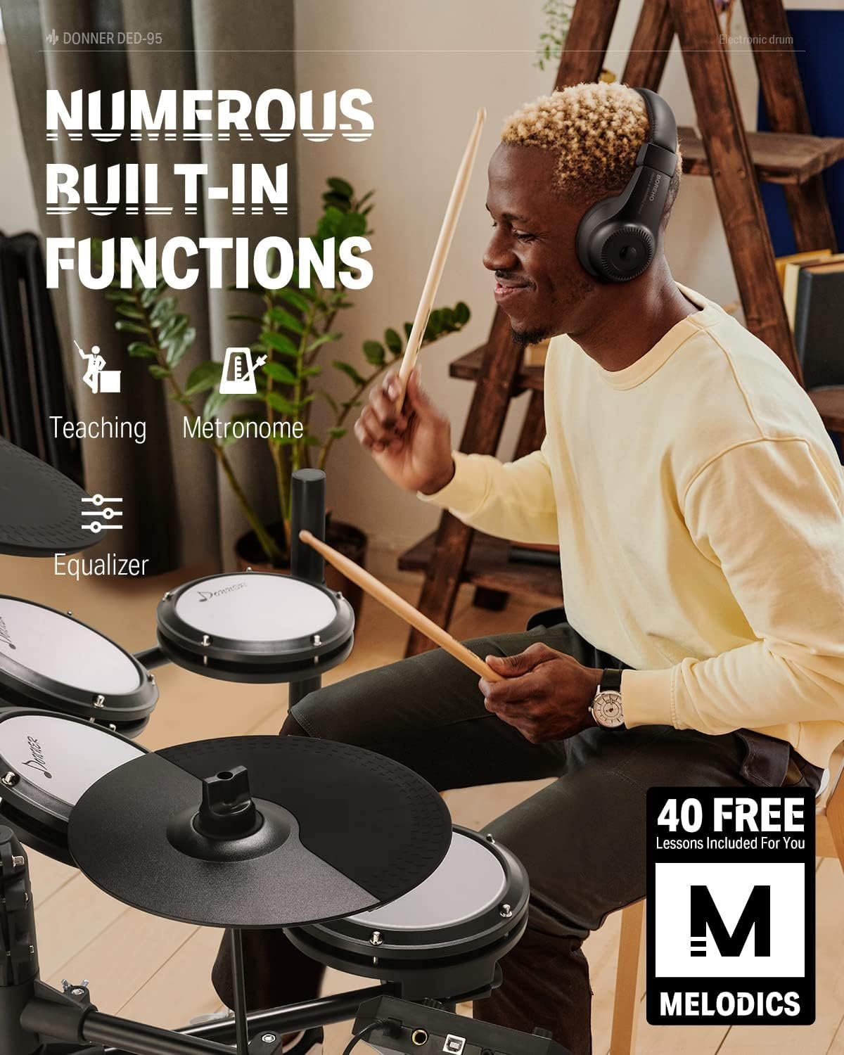 The DED-95 electric drum kit comes with 30 built-in play-along tracks, metronome, auxiliary input, and drum coach, all designed to hone and develop your drumming skills. The training and recording features of the electronic drum kit help beginners improve their playing techniques and enjoy every note they play! With an AUX IN port for playing along with various drum accompaniments, and a headphone jack for silent practice, the DED-95 is an ideal choice for apartment living. Whether you're using software or just practicing at home, the DED-95 will help you grow and progress. 40 Free virtual lessons from Melodics for fun. You can hone your skills in any style. Don't forget to ask our customer service for access to these courses! TIPS: We do not offer subscription services.